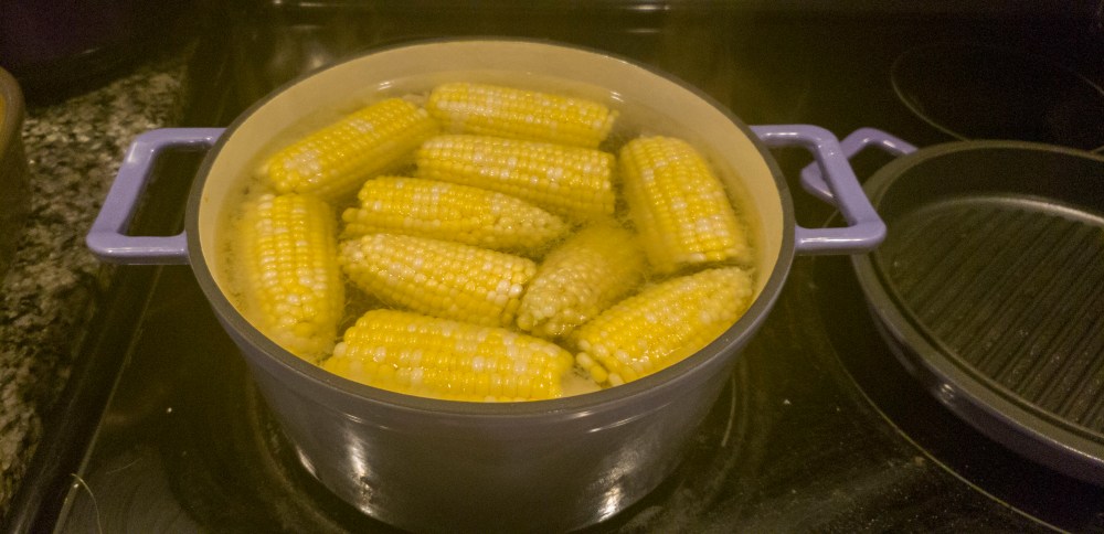 There were only five of us at Sunday dinner today so I made 6 ears of corn and broke them in half. Bring water to a boil, turn off heat, add about 1/4 cup of lemon juice, and a 1/4 cup of sugar ( you can use more or less), I put the corn in the water cover it and let it sit until it’s time for dinner. That’s it. Wait until you taste how delicious it comes out.
