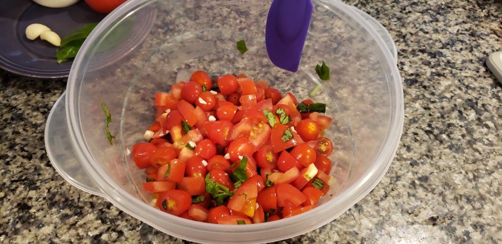 Place tomatoes, basil, and seasoning in a large bowl with lid, drizzle olive oil over the tomatoes. I place in refrigerator until I’m ready to eat. I add the mozzarella right before I serve it.