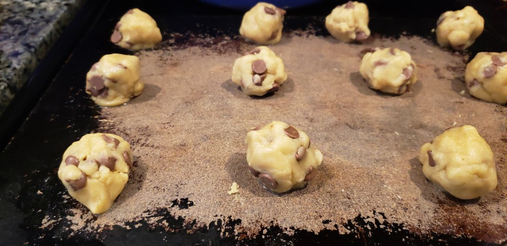 Gradually add dry mixture into the creamed mixture. Stir in chocolate chips . Using a tablespoon form small balls and place on a stone. bake about 10 minutes or until it’s the way you like your cookies.