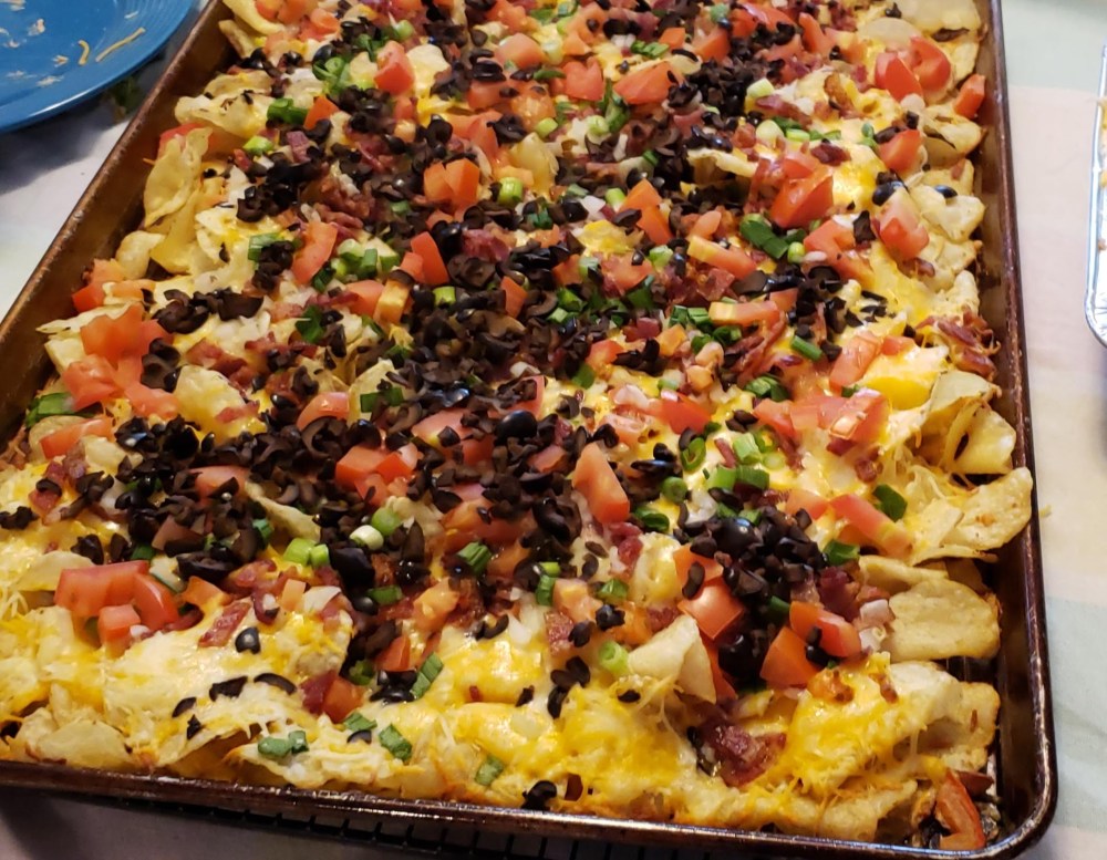 Broil bacon until it is crispy. While that is cooking, cut up the ingredients. Spray a baking sheet and put the chips on the bottom, then layer the scallions, cooked bacon, tomatoes, red onions, black olives and sprinkle the cheese evenly on the top. Bake on 350° for 15 to 20 minutes. Serve with the sour cream and salsa.