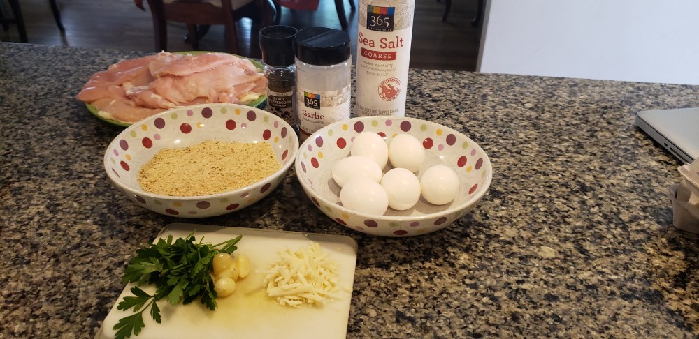 Filet the chicken, using a tenderizing mallet , place wax paper over chicken and pound until it is thin. Mix all ingredients together, except bread crumbs, mix well. Heat oil in pan on medium heat, dip chicken in egg mixture than dip in bread crumbs, make sure both sides are coated with each mixture. Saute, chicken on each sides for about 2 -3 minutes, transfer to a baking sheet and finish cooking in oven on 250° for 20 to 25 minutes or until done.