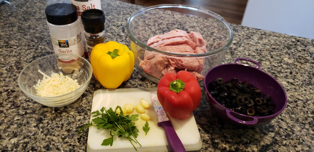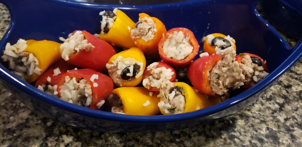 Preheat oven to 350° Prepare rice according to instructions. In a large bowl, mix together turkey meat, salt pepper, garlic powder, fresh garlic, mushrooms, and olives. Transfer meat into a skillet pan, cook for a few minutes, add cooked rice, parsley and cheese, simmer for another 5 minutes. Spoon turkey mixture into cut peppers and place in a baking dish. I usually put a layer of water on the bottom of pan before I cook the peppers. Bake until peppers are tender around 30 minutes, depending on your oven.