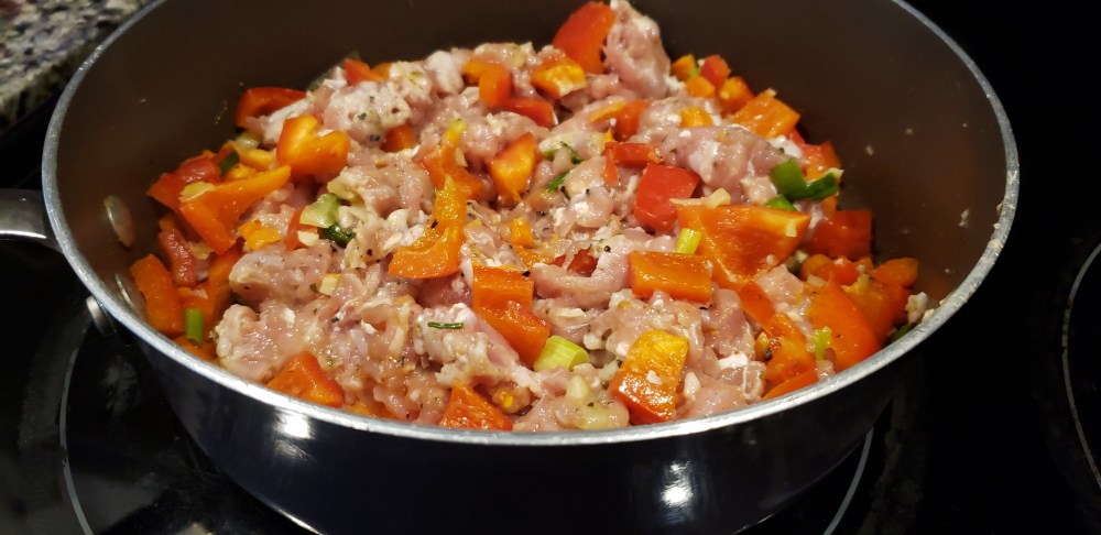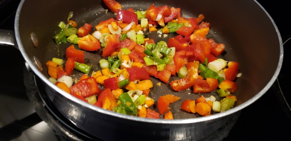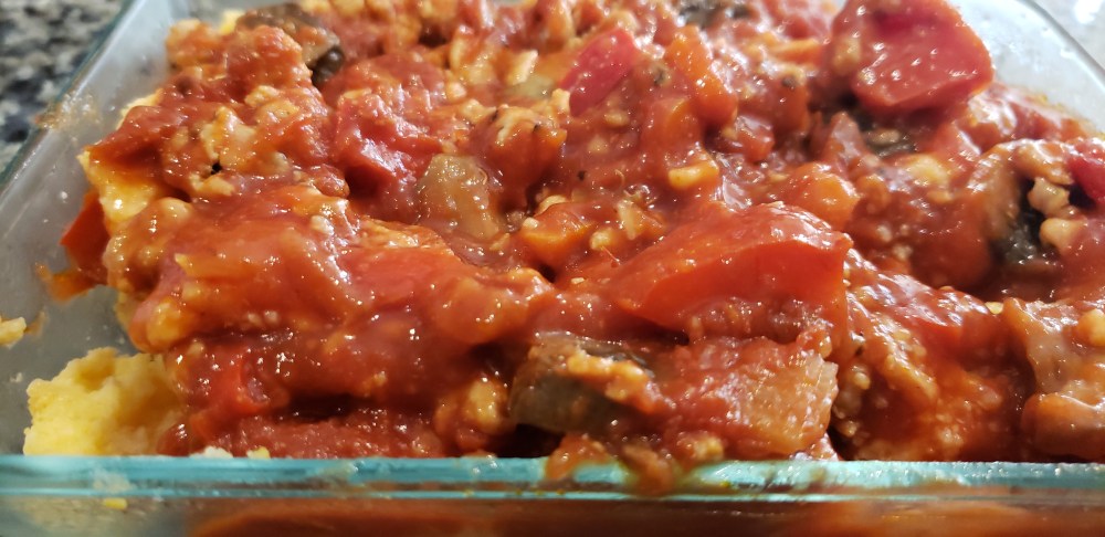Drizzle the bottom of pan with oil. Sauté the onion, carrots, garlic, peppers. While that is cooking, crumble the sausage and add to vegetables, let cook for about 10 minutes. Add the crushed tomatoes and simmer. I usually add the mushrooms right at the end so they don’t overcook. While that is cooking, I make the polenta. Serve the sausage and vegetables over the polenta, sprinkle with cheese. I hope you enjoy this version!