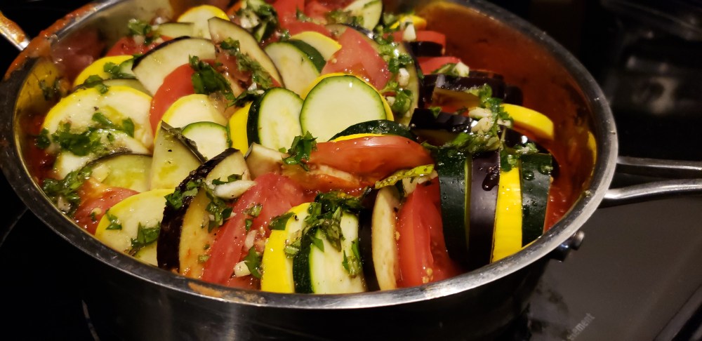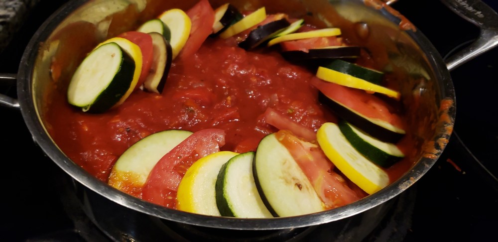 Today I feel like vegetables for dinner, my grandmother used to make this delicious summer vegetable dish; of course there isn’t a recipe to follow. I looked through my recipes and found a ratatouille recipes that I made in the past, so I did a mixture of hers (what I could remember) and mine. It came out quite tasty, and very easy to make.
