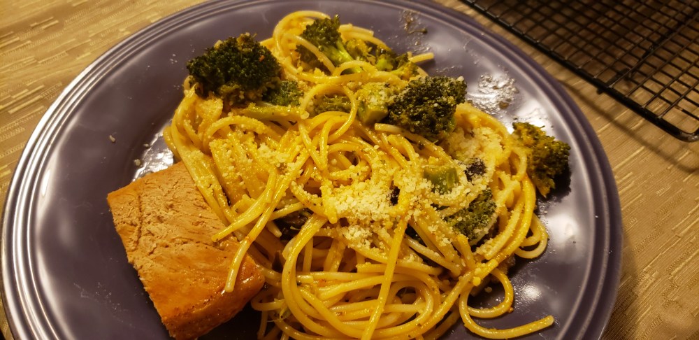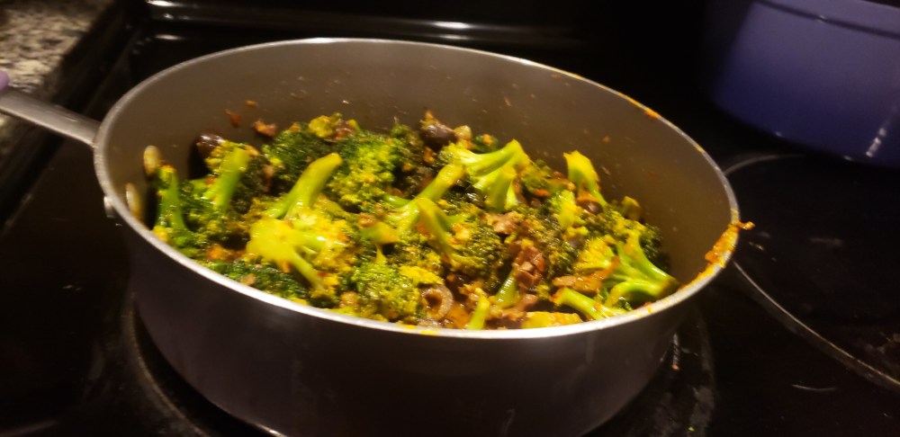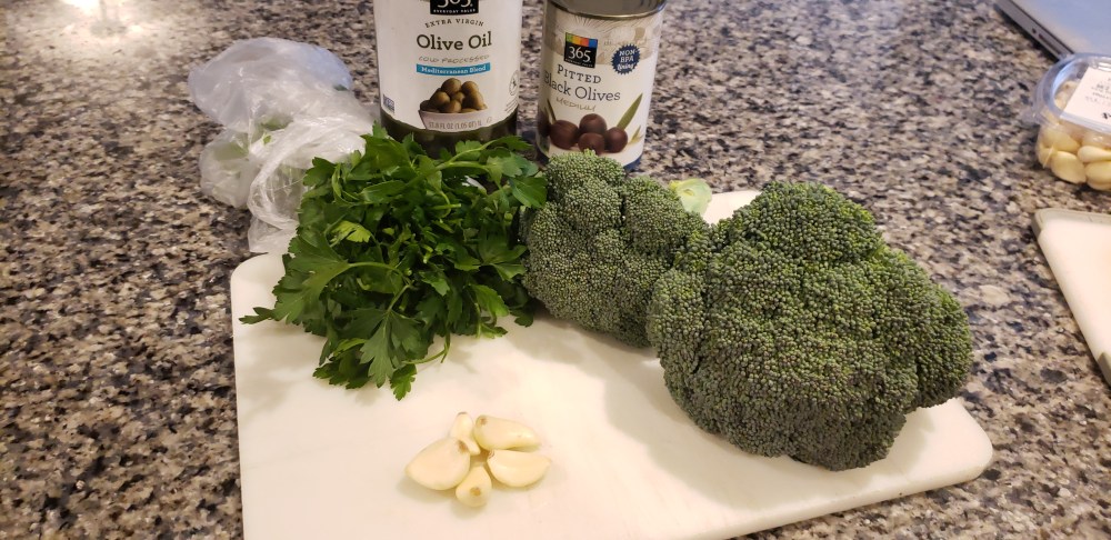 Today was the day that I was going to start walking again. I haven’t walked since I broke my foot. I planned on meeting my friend Deby. We were going to shop a bit and then on to walking. Well, we ended up going for a cup of coffee and talking for a couple of hours; needless to say we didn’t walk. While we were having coffee we talked about what I should make for dinner, a conversation I have with myself most days. Deby suggested a broccoli dish with garlic and olive oil. Now I am thinking about all the things I can do with broccoli. After we left, I went to my favorite store, Aldi, to pick up a few things and to see if they had anything fun to buy. I love going there to see all the new stuff they put out. My mother thinks I’m obsessed with the store. I picked up a few things, went home and started to cook. This is what I came up with.