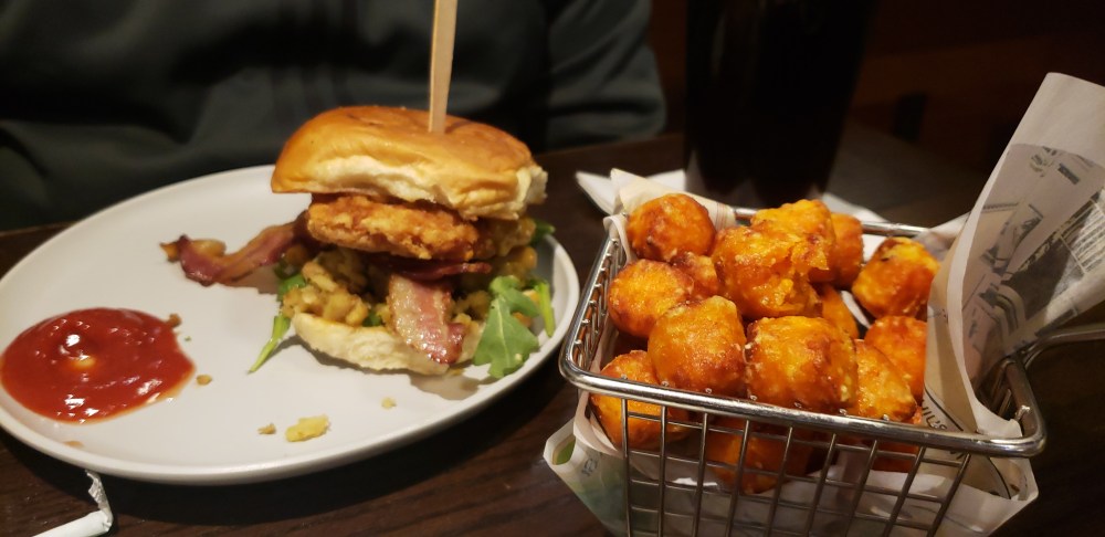 chicken and bacon sandwich with stuffing and a side of sweet potato tots, Ronnie’s favorite