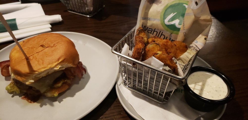 BBQ Bacon Burger with a side of fried pickles, my favorite